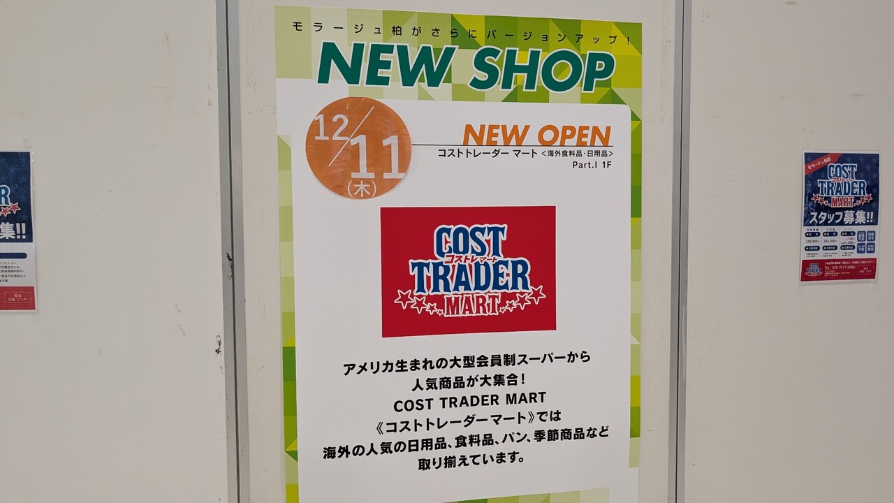 「モラージュ柏」に海外食料品・日用品「コストトレーダーマート モラージュ柏店」が12月11日オープン コメント数:0 コメント カテゴリ:柏・流山周辺(店舗・施設) by 柏の葉サイクルライフ 2025年12月09日 15:09 https://kashiwanoha-cycle-life.blog.jp/archives/51883287.html「モラージュ柏」に海外食料品・日用品「コストトレーダーマート モラージュ柏店」が12月11日オープン 前の記事 国道16号線沿いのカーディーラー「BMW 柏」の工事状況(2025年12月9日) 次の記事 「モラージュ柏」にメガネ店「JINS モラージュ柏店」が12月19日オープン 『モラージュ柏』に海外食料品・日用品『コストトレーダーマート』さんが12月11日にオープンされます。 『ココカラファイン』さんの跡地にオープンされます。 『モラージュ柏』 住所: 千葉県柏市大山台2丁目-3 https://kashiwanoha-cycle-life.blog.jp/archives/51883287.html「モラージュ柏」に海外食料品・日用品「コストトレーダーマート モラージュ柏店」が12月11日オープン タグ :#モラージュ柏#コストトレーダーマート#モラージュ柏店#ココカラファイン 柏・流山周辺(店舗・施設) - カテゴリの最新記事 前の記事 国道16号線沿いのカーディーラー「BMW 柏」の工事状況(2025年12月9日) 次の記事 「モラージュ柏」にメガネ店「JINS モラージュ柏店」が12月19日オープン « 記事一覧 » コメント コメントフォーム 名前 コメント 評価する リセット リセット 顔 星 投稿する 情報を記憶